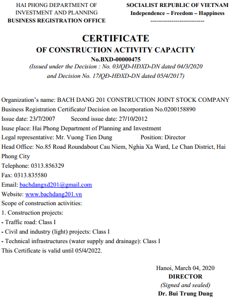 Certificate of construction capacity, ISO Certificate, Decision on establishment of business ...